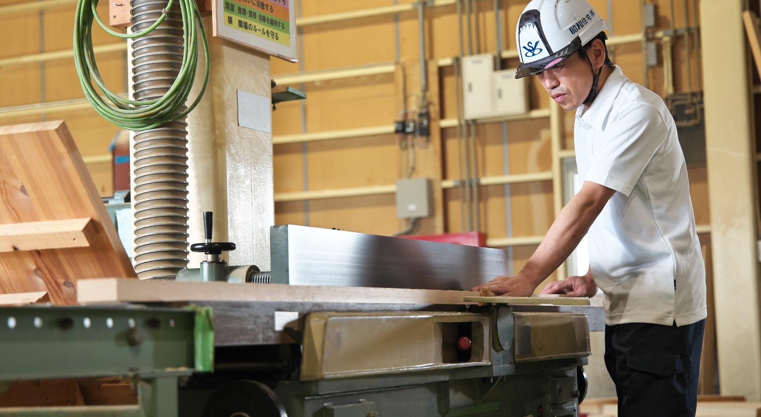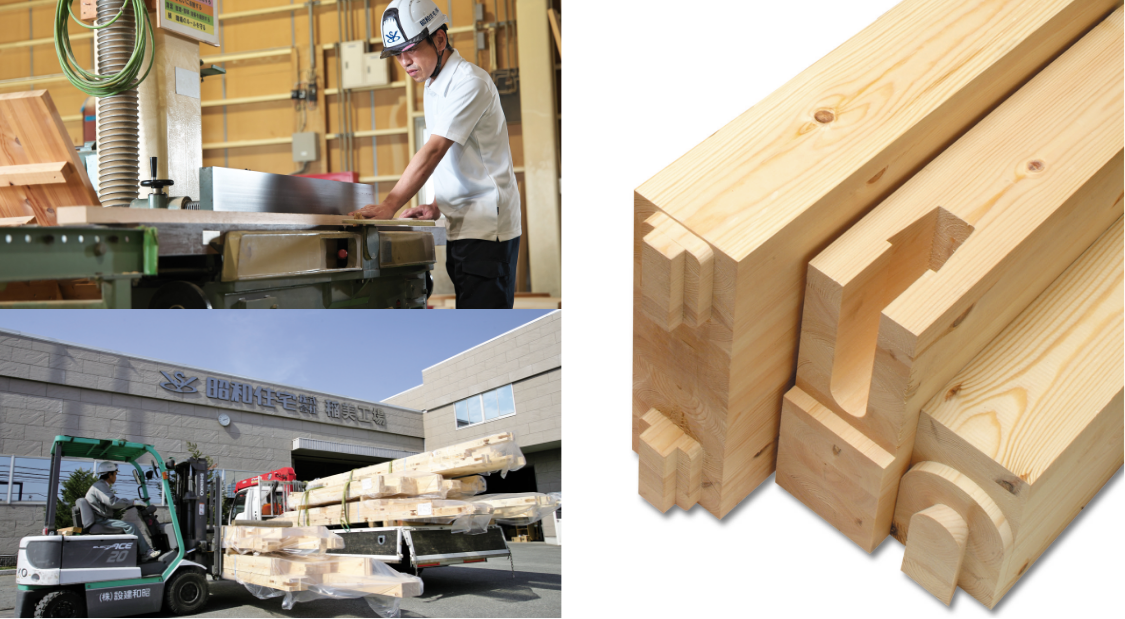 ショウワグループ㈱では構造材、造作材などすべてを自社でプレカットしています。自社プレカット工場においては全自動プレカット機等、最新鋭の機械設備を取り入れて、コンピューター制御によって次々と高精度な木材を生産。一括生産、加工を行うことでロスを極力少なくするだけでなく、工期を短縮、品質を均一化することにも成功しました。さらに、材料を一括で大量仕入れすることで、さらなるコストダウンも実現しています。
