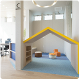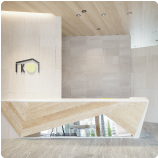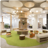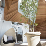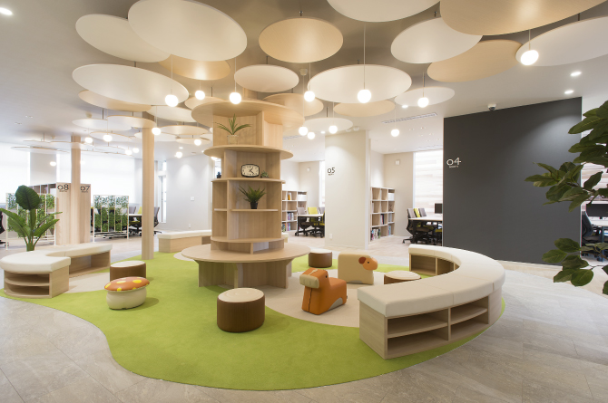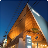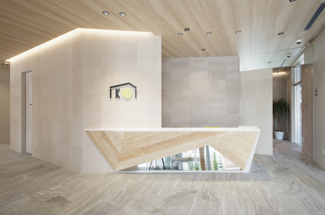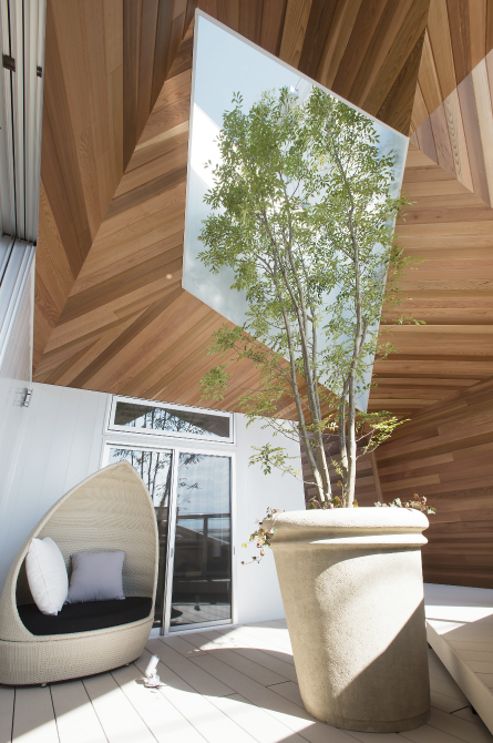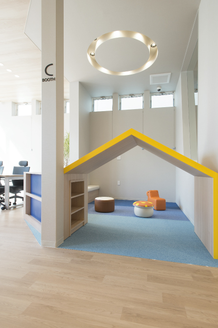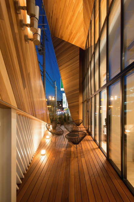 外観は、三角や多角形を用いることで非リアリティを演出し、東上に伸びているようなデザインにすることで、未来に伸びていく姿を表現しています。木の味やぬくもりを感じられるレッドシダーを使用してやわらかい、まさに「IKOI」の空間に。