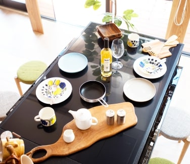 机の上で料理してる?かのようなHIコンロを備えたシステムキッチンで、お掃除も簡単でお子様にも安心!