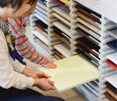 思った以上に迷うのが、外壁、床の色や材質。写真で見ただけだと、想像していたものと違うことも。色もデザインも豊富にあるので家のイメージにピッタリのものと出会えますよ♪。