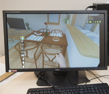 建築予定の間取りやプランが立体的に。VR体験されている方の視界がモニターでも見えるので他のご家族も確認できます。