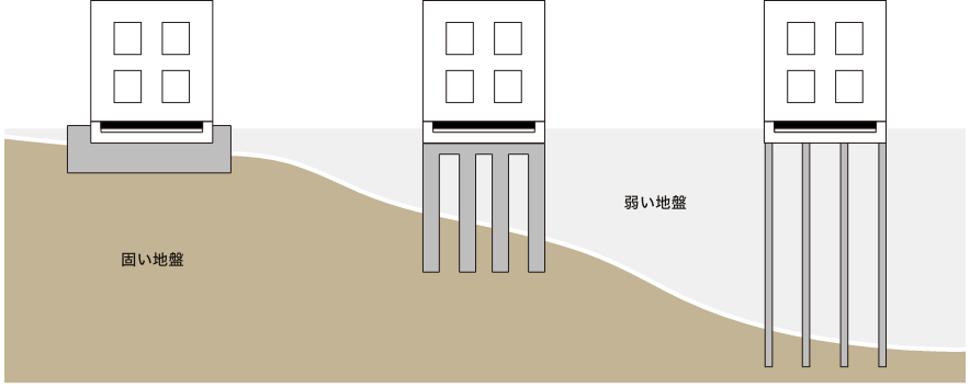 軟弱地盤が続く場合、固化剤を柱状に混入して改良。設計地盤まで掘削し、地中でできる大きなコンクリートの柱が建物を支えます。