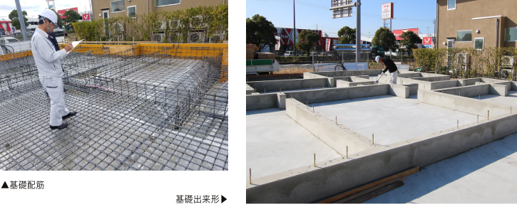 軟弱地盤等にも対応が可能なベタ基礎工法を標準で採用しています。建物の荷重を地盤に対し面で伝える構造なので、布基礎工法に比べより建物の荷重を分散させることができ、地耐力が不足している場合に適した基礎仕様になります。