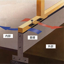 基礎パッキンによって土台は直に基礎に接することがなく、土台の下部が通気面となるため、常に乾燥した状態が保持されます。そのため、腐朽菌の発生を未然に防ぐことができます。