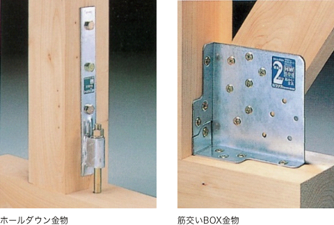 ホールダウン金物は地震時などに柱が土台や梁から抜けるのを防ぐ役割をし、筋交いBOX金物は土台・梁・筋交いの3点で耐力壁をがっちりと固めます。