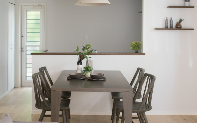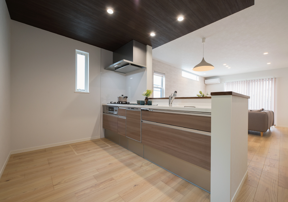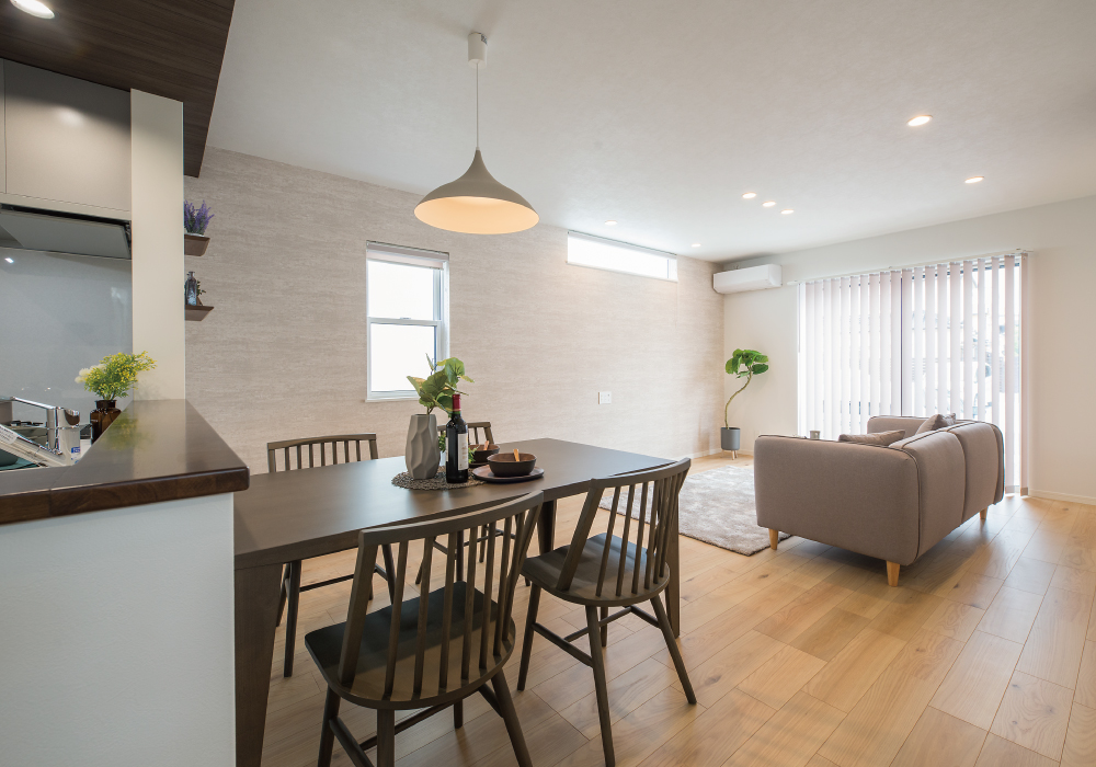 キッチンからダイニング、リビングまで見渡せる開放的な間取り。自然と家族が顔を合わせ、会話が生まれる設計です。
