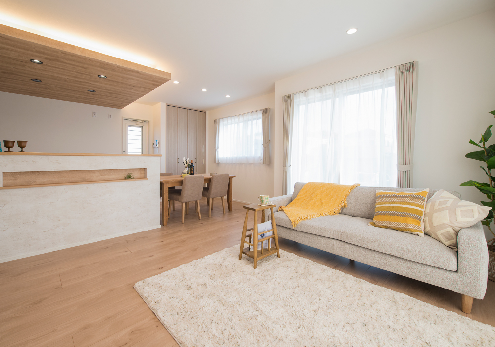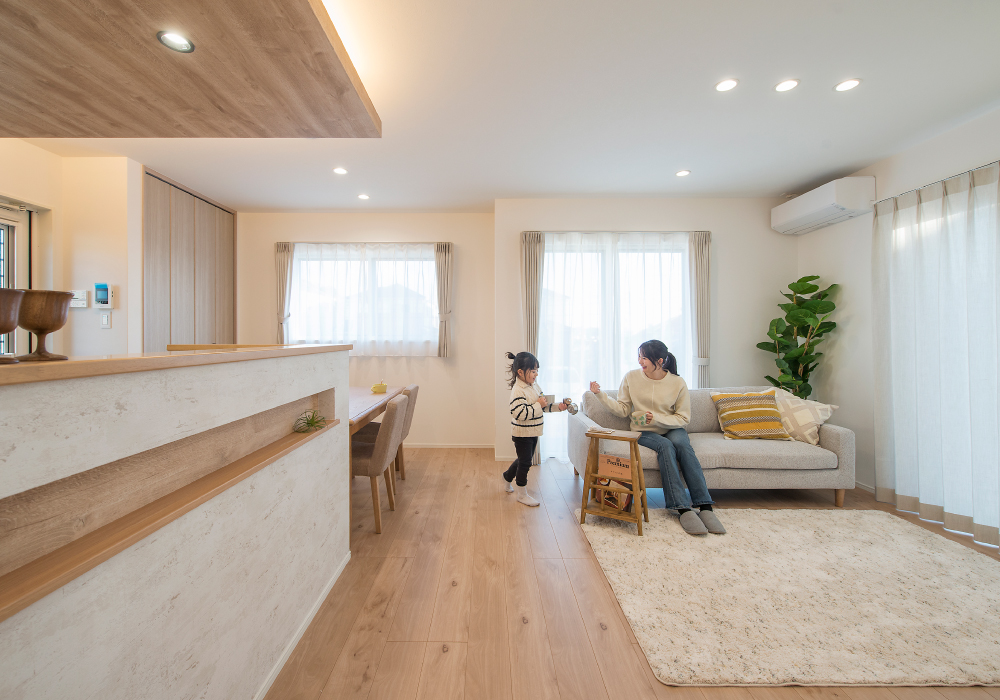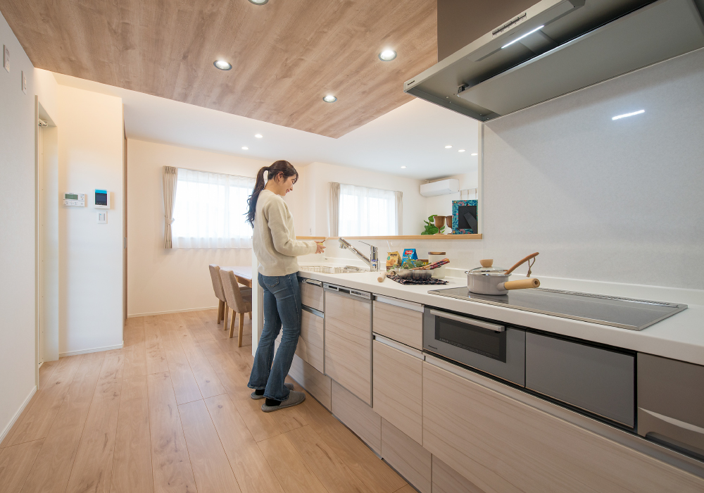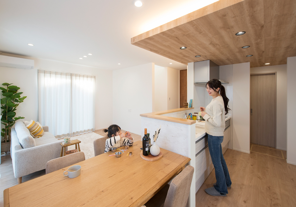 キッチンの折り下げ天井と間接照明がオシャレ。