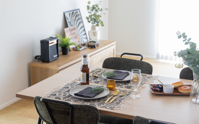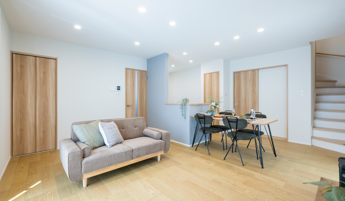 16帖のLDKには、天然木本来の風合いや豊かな表情を感じるオーク柄の床材を使用。