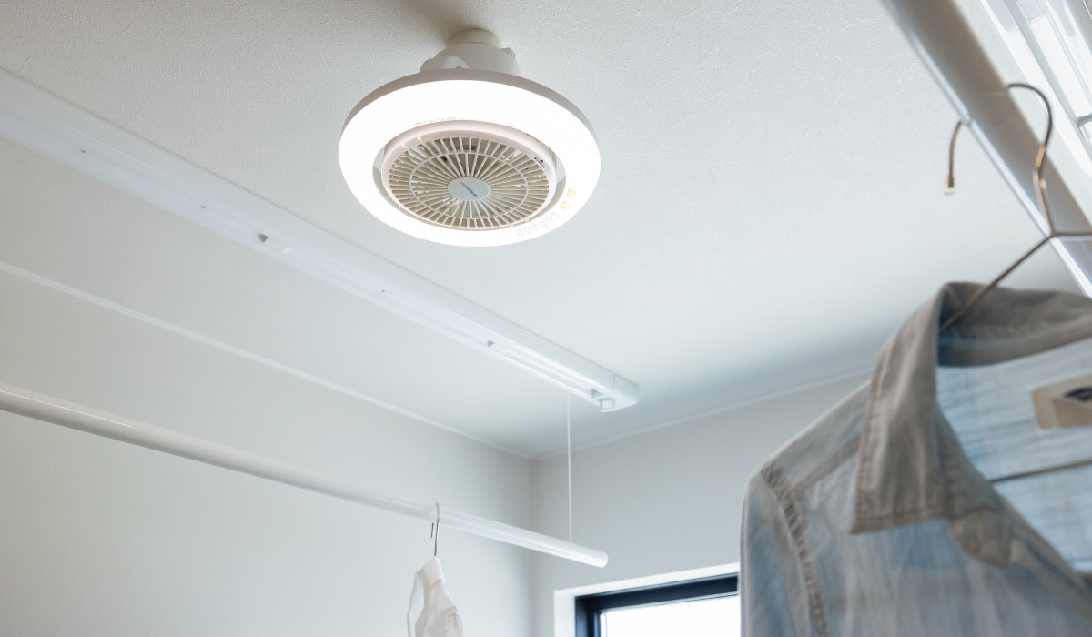 フリースペースの上部には室内物干しやサーキュライトを設置し、利便性を向上させています。