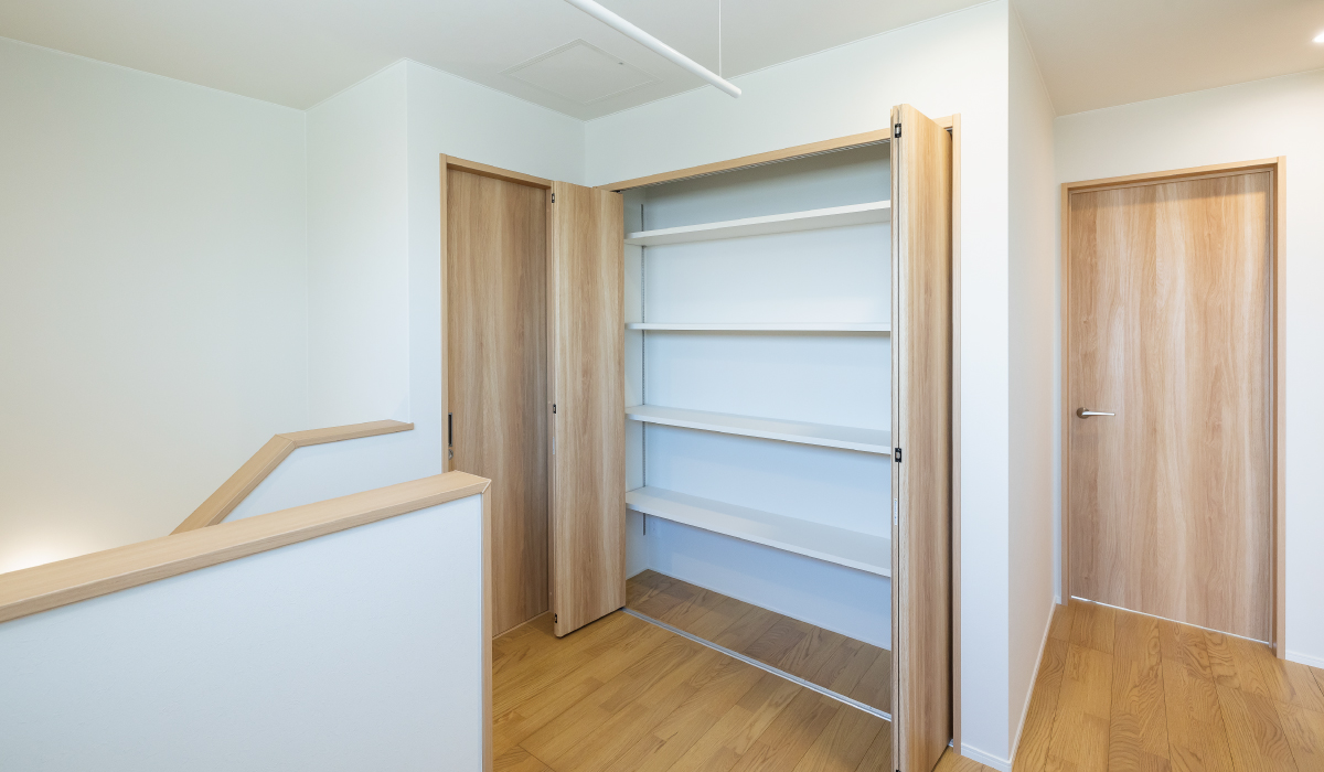 家族共有で使える収納スペースを2階ホールに設置。洗濯物用品を片付けておくこともできます。
