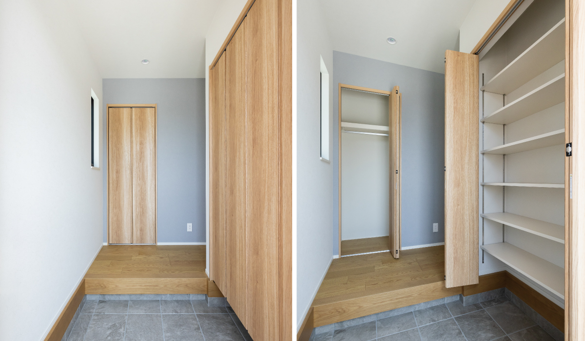 シューズクロークと収納スペースの2ヶ所設け、玄関周りをすっきりと片付けることができます。