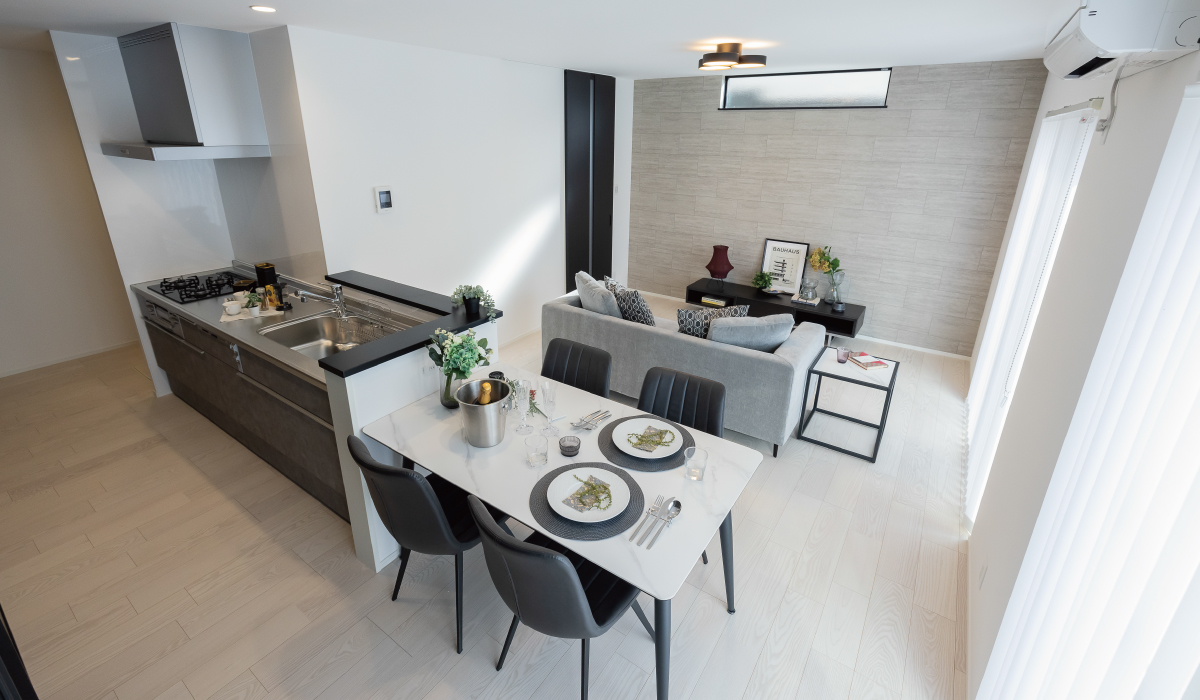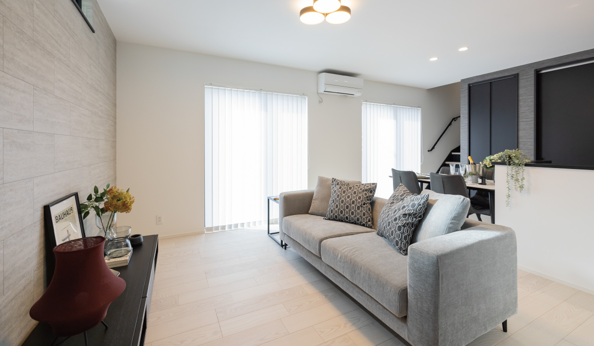 アッシュホワイトの床材とグレーのアクセント壁が印象的なリビング。