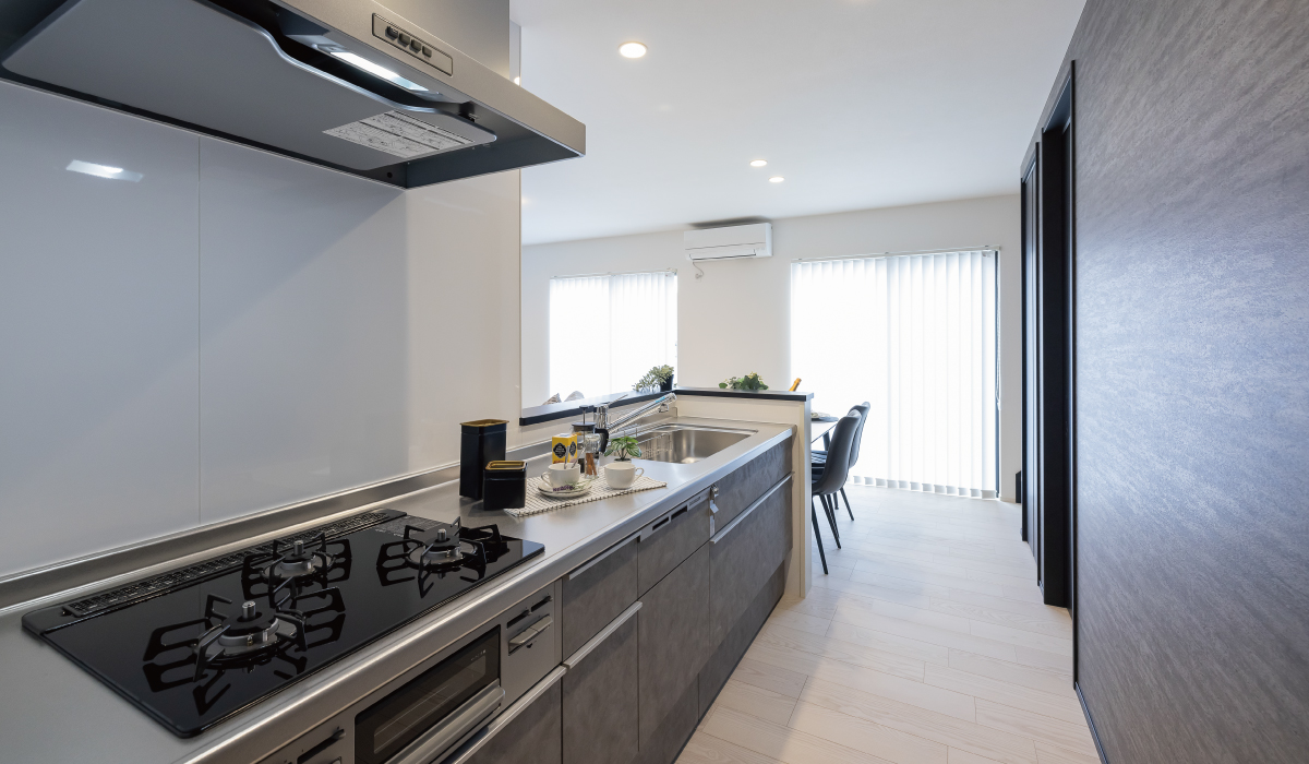 食器洗い乾燥機やクッキングコンセントの付いた使い勝手の良いキッチン。