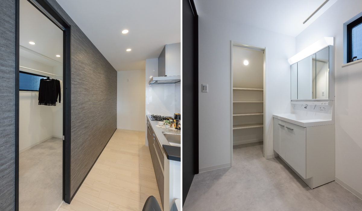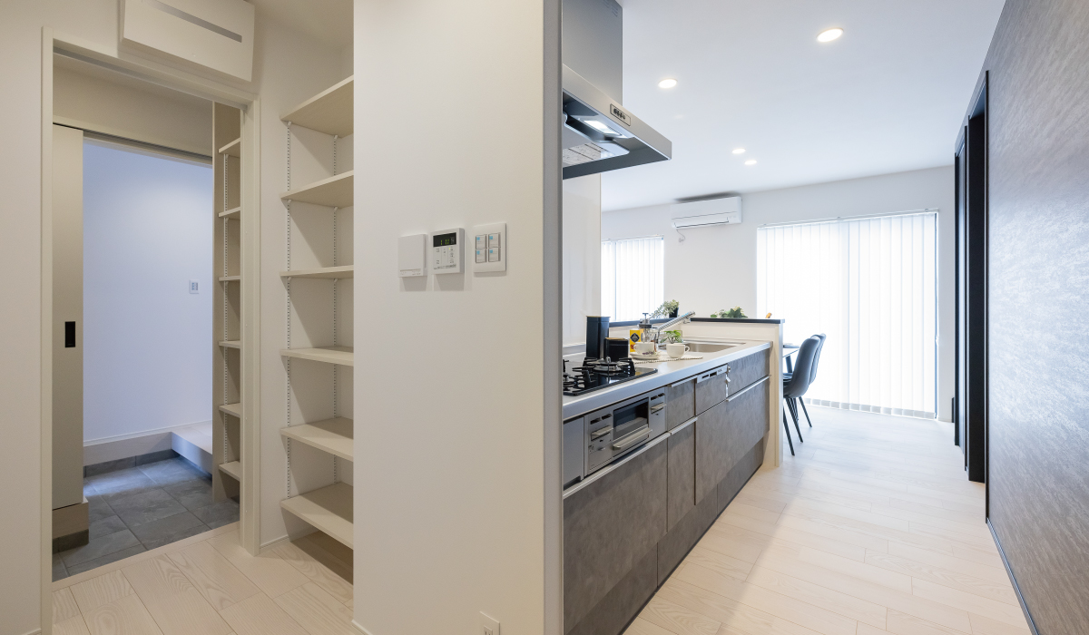 玄関⇔パントリー⇔キッチンへの動線は帰宅時片付けながら移動できます。