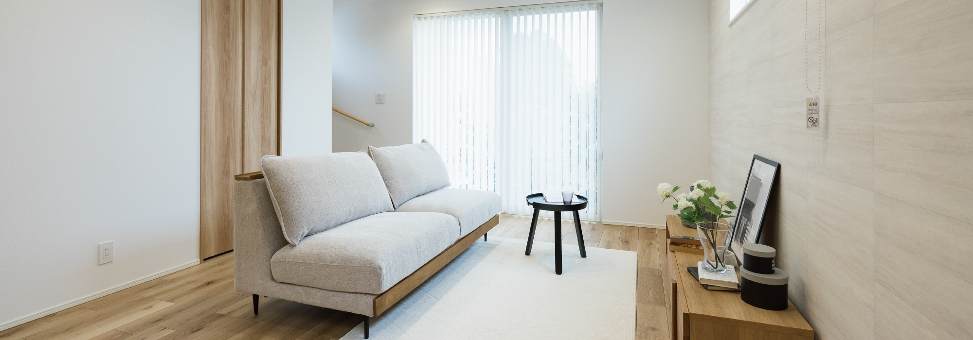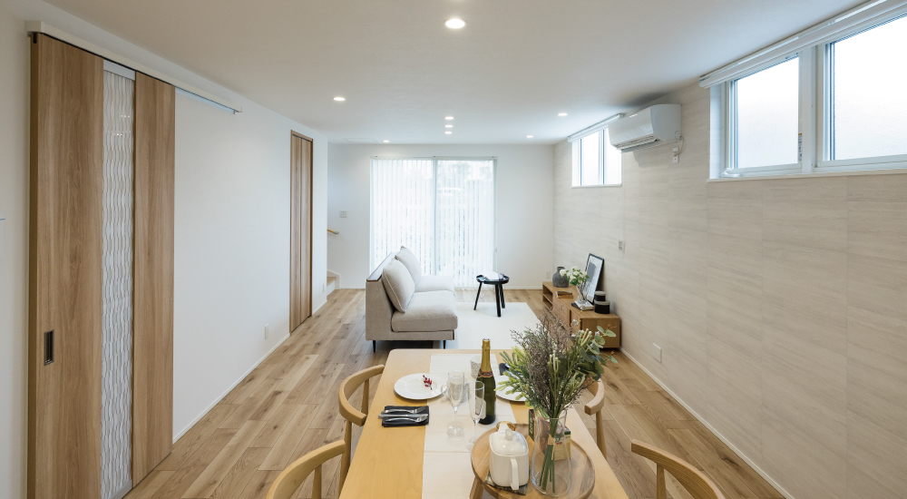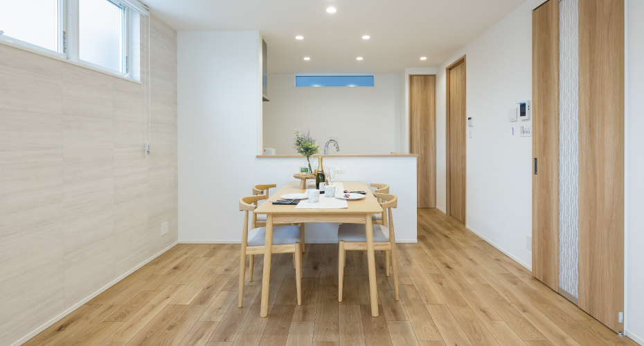 優しい木目の明るいフロアに石調のアクセントクロスを採用。17帖以上あるリビングが明るく、広々とした印象に。