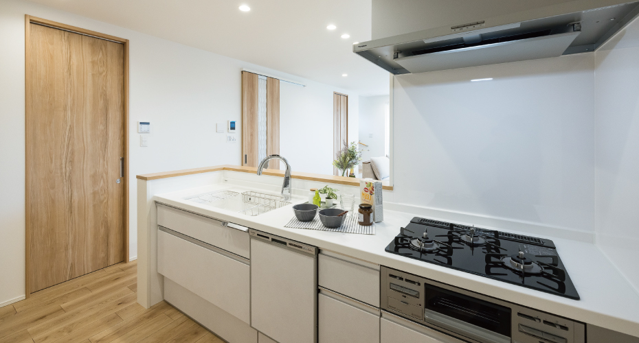 リビングを見渡せる対面式キッチンは吊戸棚を無くし開放感をプラス。