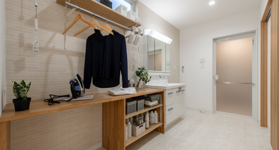 ゆったりサイズの洗面所ではアイロンがけや洗濯干し、収納ができます。2WAY動線で家事もはかどります。