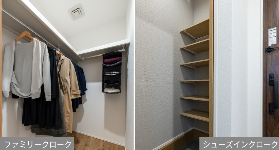 家族の靴だけでなく、アウトドア用品なども収納できるシューズインクロークや家族共有のファミリークロークを設置。