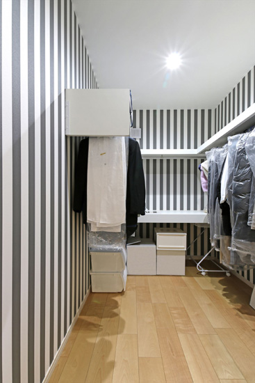 洗面所から近い位置に配したウォークインクローゼット。 ストライプの壁が清潔感を漂わせます。