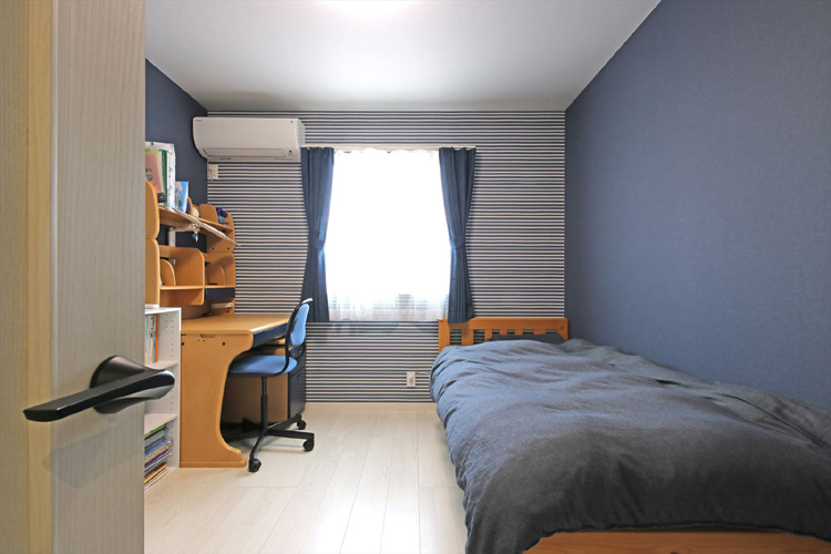 お子様の部屋は家の外壁と同じくネイビーを基調にまとめた爽やかな空間。カーテンとシーツ、壁紙の色が同じで、素敵なコーディネイトです。