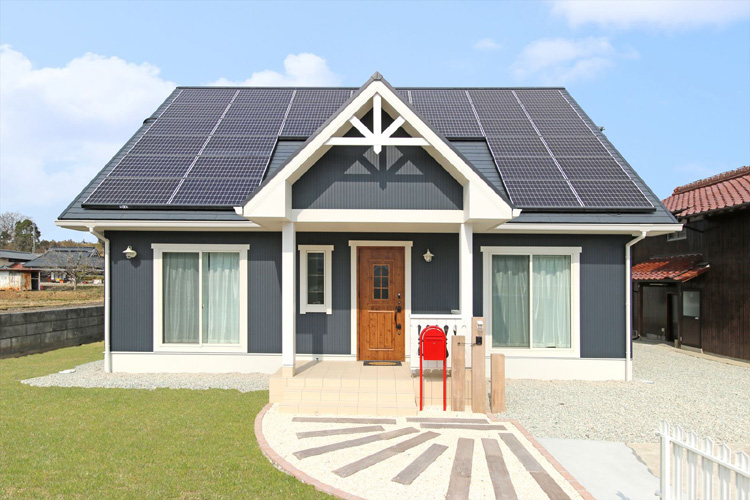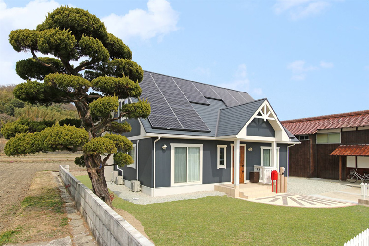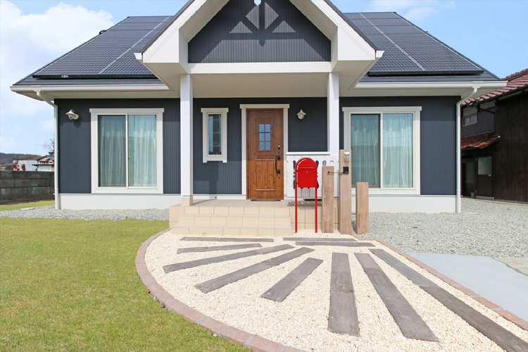築100年以上の本家普請の母屋を解体して建て替えた家は N様が大好きなネイビーブルー色のビックルーフスタイルのスウェーデンホーム。約10KWの太陽光発電も搭載したZEH仕様です。クラシカルな外観に最新の機能を備えた住宅になりました。