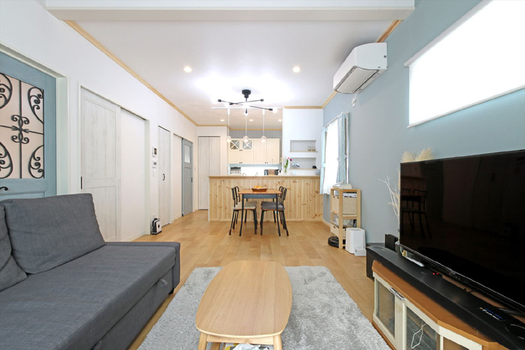 ドアとアクセントクロスをスカイブルーの挿し色で仕上げた リビングルーム。爽やかな空間に仕上がりました。