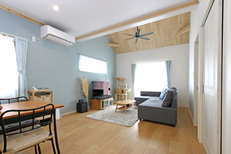 大屋根の形状をいかした解放感のある勾配天井のリビング。黒い6枚羽根のシーリングファンが良く似合います。