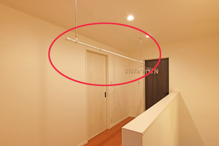 外から見えない2階廊下に作った洗濯物干しスペース。暖炉の熱で、洗濯物もよく乾くそうです。