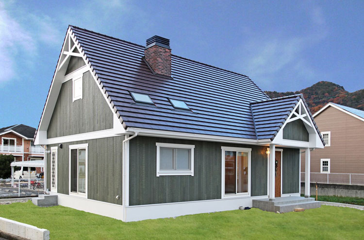 K様が小さいころから憧れ続けた大屋根(ビックルーフ)の外観です。アトリエやLDKもしっかりまとまっていて、使い勝手もよくできています。正面の妻飾り(ゲーブルオーナメント)はK様デザインのオリジナルです。