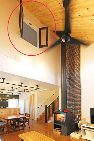 装飾だけではなく、暖気を取り込む役目を兼ねる室内窓。優雅に廻るシーリングファンと色を合わせました。