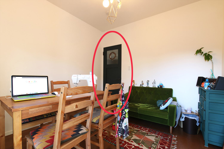 グリーンのソファとワントーン濃くした黒板グリーンのドアが印象的。 そこにキリムのラグ&クッションが部屋に華を添えます。拘りの空間での作製活動はとても楽しそうです。