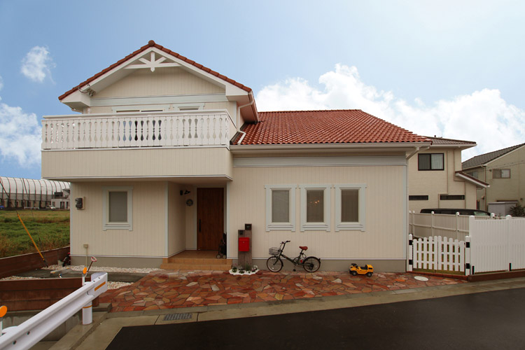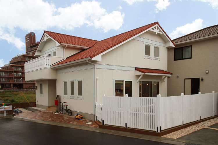 大きな勾配屋根にオレンジ色の瓦、オフホワイトの壁がウェストコーストっぽくて素敵です。淡いブルーの帯がスパイスを効かせています。輸入住宅ならでわのカラーバランスです。