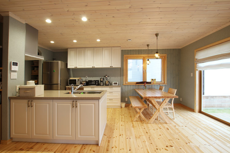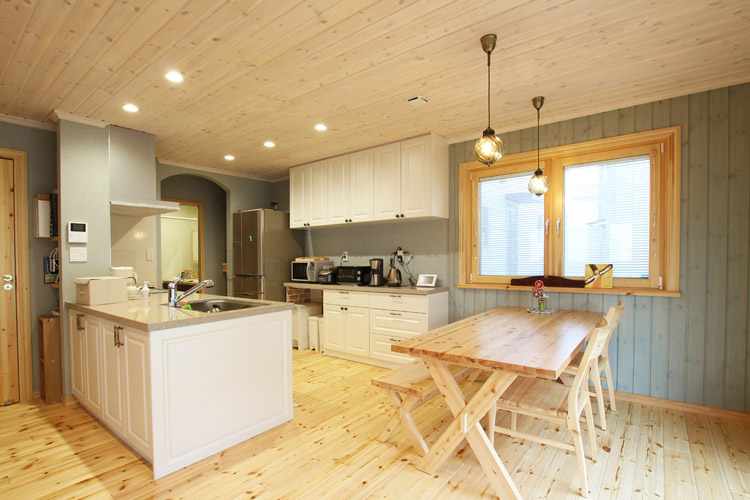 ナチュラル色の床、真っ白なキッチン、ブルーグリーンの壁。白染めの天井パインと難しいカラーバランスですが、しっかりまとまっています。海外住まいのセンスが光ります。