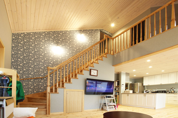 斜めに広がる素敵な天井には北欧パイン材を貼っています。吹き抜けに沿っての欄干手摺も素敵ですが、見せ場は何といっても花柄の壁紙。ワントーン濃くした色で抜群の存在感です。