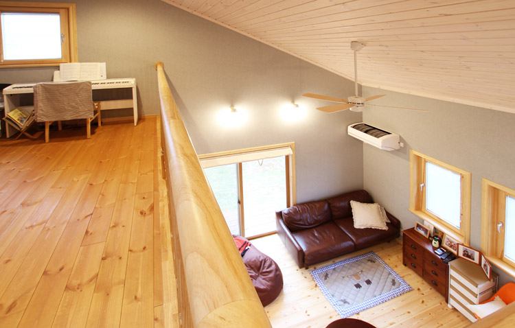 2階ホールには奥様の電子ピアノが置かれており、手摺を介して1階にリビングが展開しています。バーティカルなこの空間… いいですね。