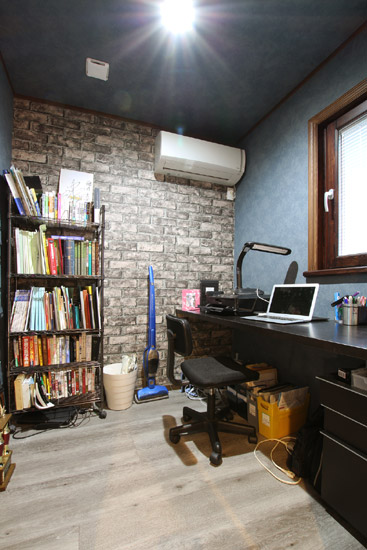 ブリックタイル調の壁紙をあしらった、ブルックリンスタイルの書斎。アメリカ暮らしをされていた御主人ならではのセンスです。