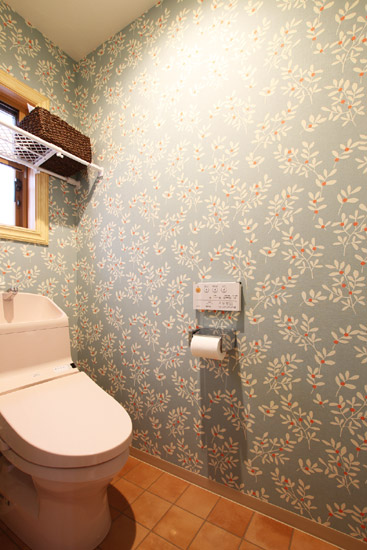 宿泊客の多いF様宅は、和室の代わりに1階に客間があります。ブルーグレー&花柄の壁紙は白いペイント窓と黒いスウェーデン産ブラスト床にベストマッチ。 素敵な空間に仕上がりました。