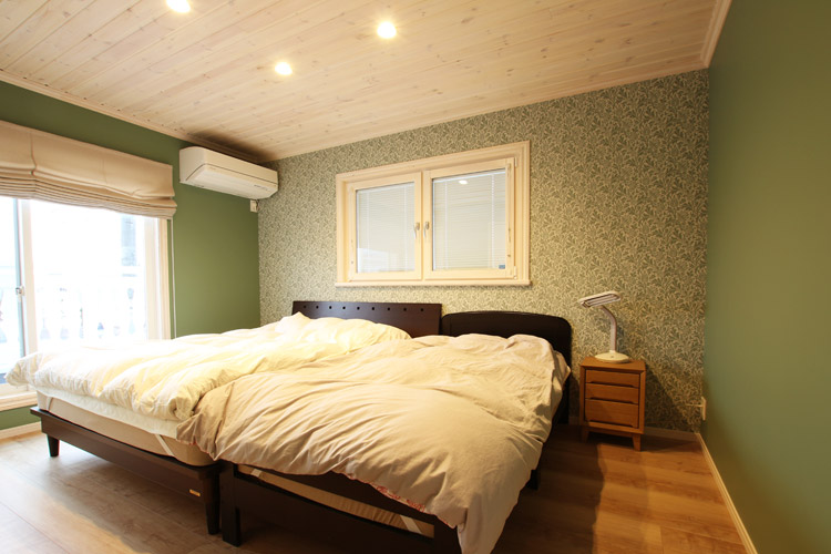 モスグリーンのグラデーションが寝室にピッタリです。天井も北欧パインを貼っていますので、フィトンチッドを放散し、良く眠れるお部屋になりました。