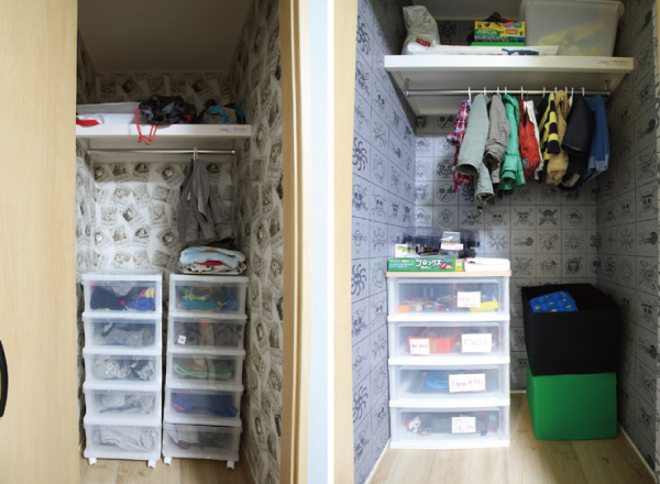 子供部屋の収納はどちらもワンピースの壁紙です。居室には勇気がいりますが、これなら楽しく使えます。奥様のアイデア… 脱帽です。