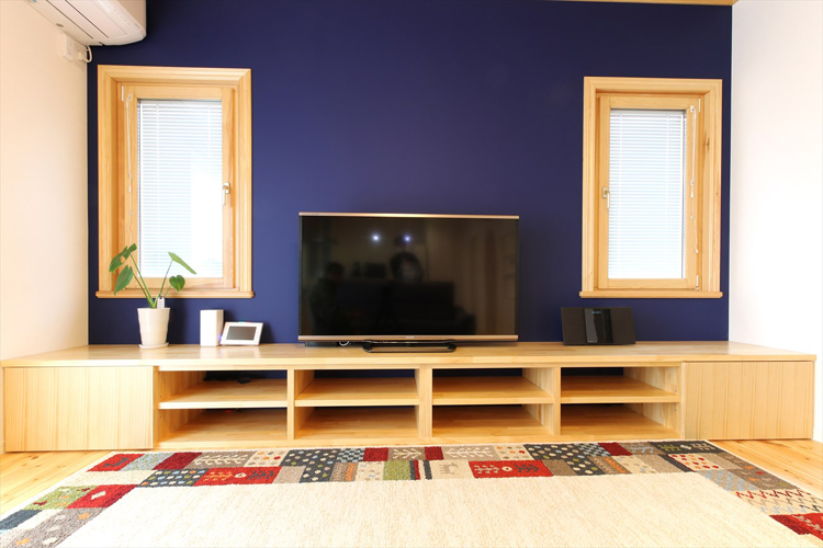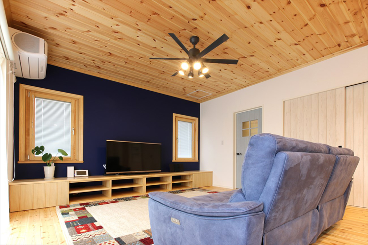 リビングのアクセントクロスはネイビーブルーで仕上げ、グラデーション するように青系のドアとソファをコーディネイトされています。何ともスタイリッシュなリビングに仕上がっています。