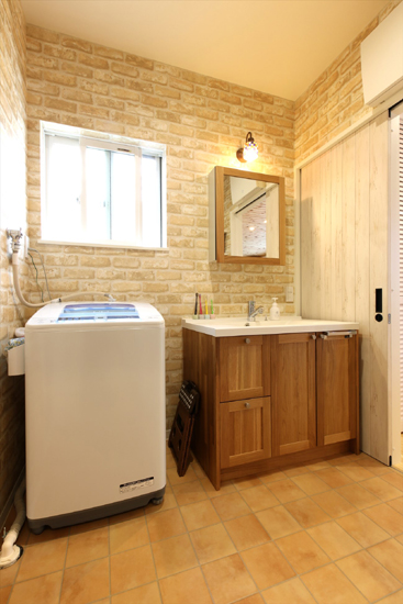 ブリック調の壁紙に合わせて選ばれた、シンプルな洗面化粧台。鏡の裏にも収納が付いています。