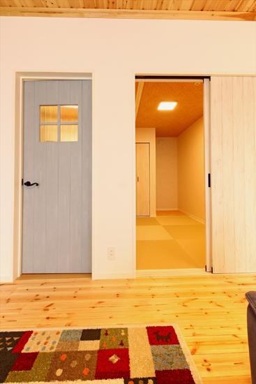 淡いブルーのドアと和室。違うテイストですが、良くマッチしています。