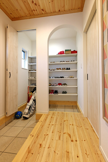 床も天井もパイン材で仕上げたナチュラルな 空間にエコカラットのテキスタイルをプラス。なんとも印象的な玄関に仕上がっています。