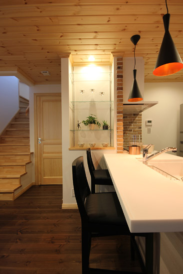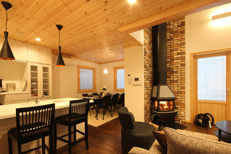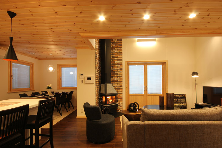 ボトムヘビーなダークブラウンの床にナチュラルの天井材、窓もナチュラルと基本的な色合いに黒い家具がアクセントになり、空間を締めています。