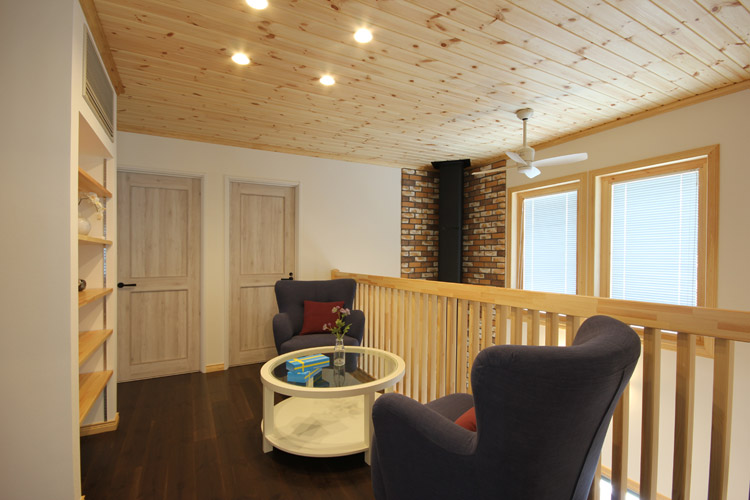 吹抜けに沿って展開する空間です。 本棚とソファセットを置いています。ソファはキャスティー展示場から移設したもの。勿論北欧製です。