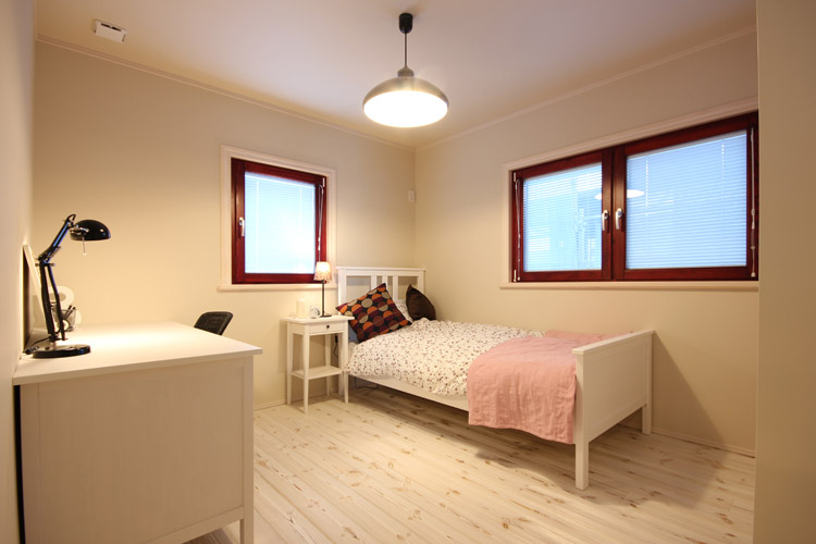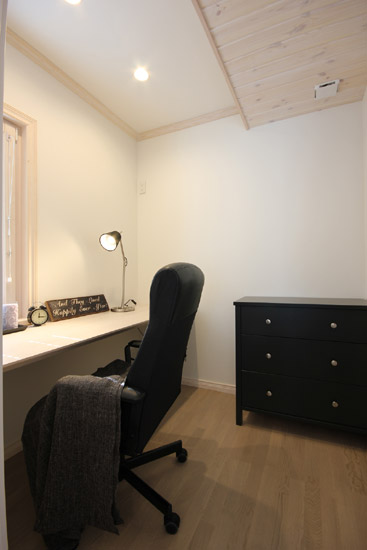 軒を深く、桁高を抑え、モールディングで水平ラインを強調したスタイル。ベーシックなスウェーデンホームのスタイルですが、ディテールには細やかな工夫を凝らしています。
