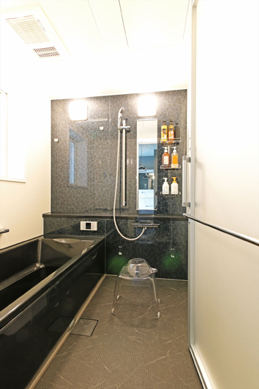 透明感のある黒いバスタブにクリア色のお風呂アイテムがよく似合っています。