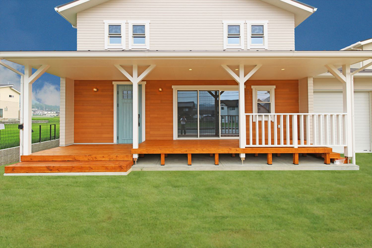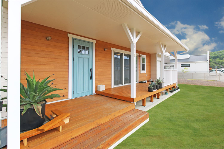 いつもよりカバードポーチを長くするために両サイドから袖壁を伸ばしました。その壁を見切りにして壁の色を変えたのはY様のアイデア。デッキの色と合わせました。