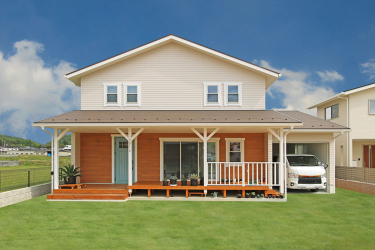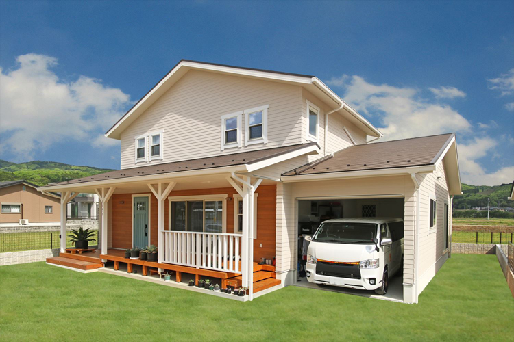 長く張り出したカバードポーチとビルトインガレージが特徴です。アメリカの西海岸に佇むサーファーズハウスをイメージしました。