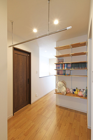 2階ホールは本棚と物干しスペースになっています。空間を無駄なく使いやすく利用できます。